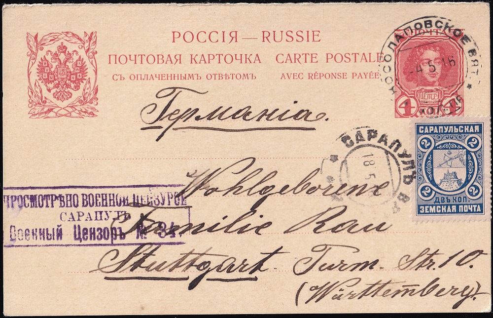 4-Kopeken-Karte aus Kossolapowo nach Stuttgart. Die Karte lief über Sarapul. Dort wurde geprüft (Speeckaert Typ 3) und zusätzlich eine 2-Kopeken-Marke aus Sarapul aufgeklebt.