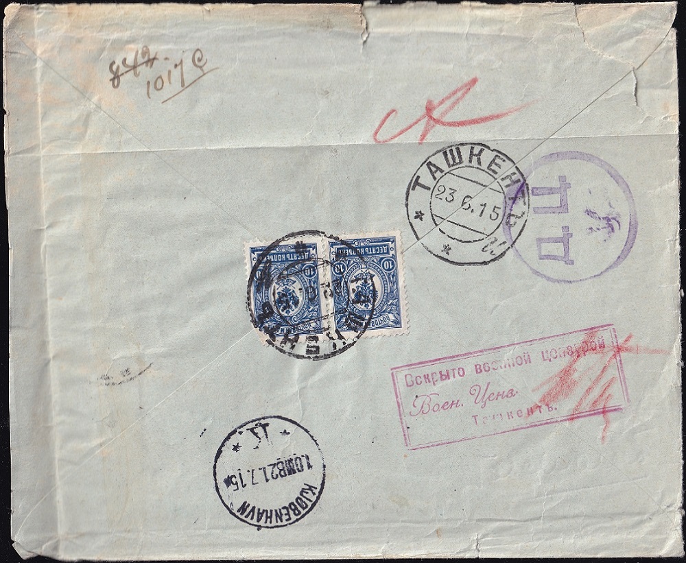 Brief aus Taschkent nach Kopenhagen. Zensurstempel ist der Typ 3 mit Unterschrift des Prüfers. Der Brief lief über Petrograd, wo erneut geprüft wurde (Speeckaert Typ 6 hier in später Verwendung).