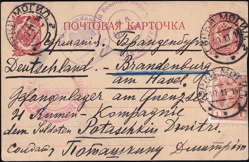 Karte vom 10.11.1914 aus Gorki, Gouvernement Mogiljew, Militärbezirk Minsk. Prüfer war I.A. Artemjew, der auch in Gorki gearbeitet hat. Die Karte lief in das Kriegsgefangenenlager am Quenzsee in Brandenburg an der Havel. Den Zensor Artemjew hat Speeckaert nicht aufgeführt.