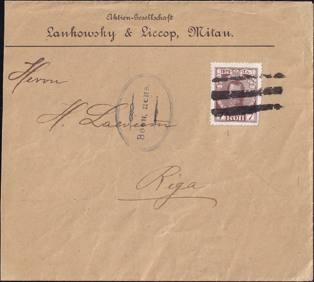 Brief aus 1914 ohne Tagesstempel aus Mitau nach Riga. Die Marke ist mit einem stummen Stempel entwertet, der Brief in Mitau geprüft (Typ 1). Hier ist schön die Unsinnigkeit der stummen Stempel erkennbar, da auf dem Firmenumschlag der Ort angegeben ist, was ja durch weglassen des Tagesstempels unterbleiben sollte.