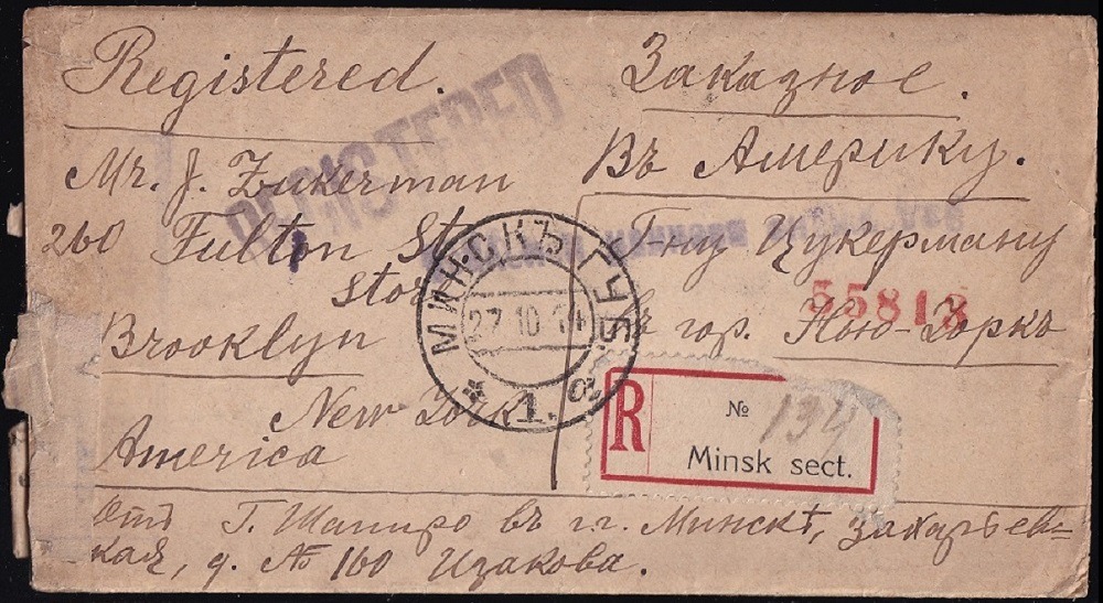 Aufgegeben am 27.10.1914 in Minsk (vielleicht kann jemand helfen, wofür das Kürzel sect. steht?). Dort wurde der Brief auch geprüft., zumindest denke ich das. Der Zensurstempel ist der Einteiler Дозволено  военной цензурой (Zugelassen Militärzensur). Er ist auf dem Brief etwas schwer zu sehen und verschmiert. Es ist somit der früheste, in Minsk verwendete Zensurstempel. Speeckaert hat ihn nicht notiert. Gesendet werden sollte der Brief auch in die USA. Der Brief lief ebenfalls über die Prüfstelle in Petrograd, wo mit einem Verschlussstreifen des Militärbezirks der Brief zugemacht wurde. Dort benötigte man dreieinhalb Jahre, bis man den Brief endlich weiterleitete. In New York angekommen ist er dann am 9. Februar 1918.