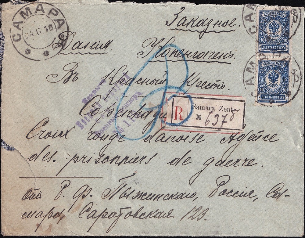 Brief vom 24.5.1916 aus Simbirsk mit dortiger Zensur nach Kopenhagen. Zensurstempel sind die Typen 6 und 12, die Speeckaert nur in violett angibt. Interessant ist meiner Meinung nach vor allem der Typ 6. Bei Speeckaert ist nämlich das "No. 20" etwas weiter nach rechts verschoben. In beiden Fällen ist dieses etwas nach oben gerückt, was mich zur Annahme bringt, das dieser Teil austauschbar war oder gar extra gestempelt wurde.