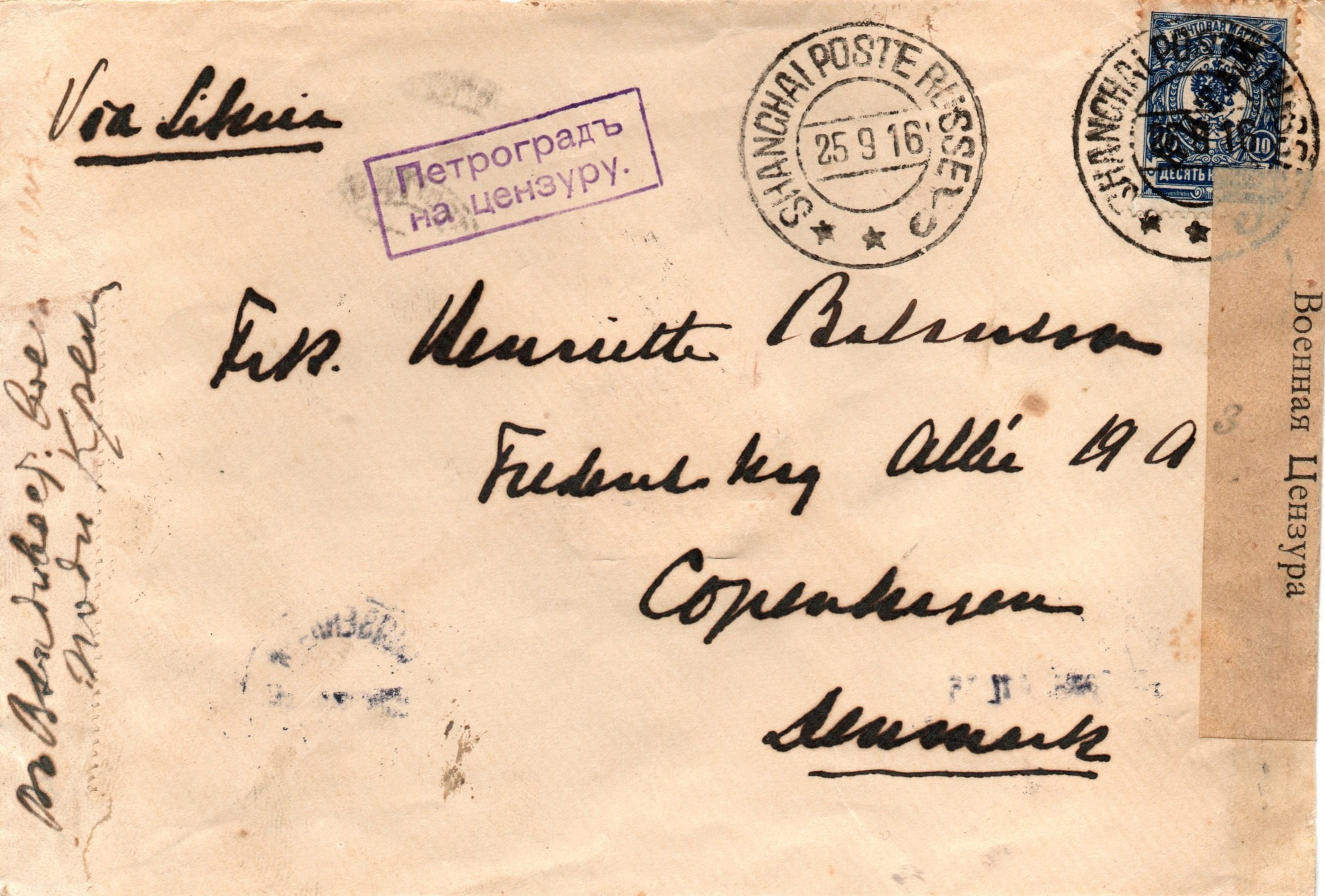 Es handelt scih um einen Transsibirien-Brief aus Schanghai nach Kopenhagen aus dem Jahr 1916. Er hätte also auch in den Transsibirien-thread gepasst aber hier steht ein Zensurstempel im Mittelpunkt.