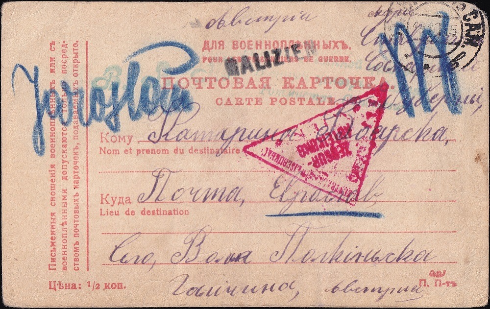 Karte vom Juni 1916 aus Papuzy (?) nach Wojnicz (Galizien). Geprüft wurde in Sysran. Zensurstempel sind die Typen 5 und 9 (hier die Initialen B.I.Schtsch.).