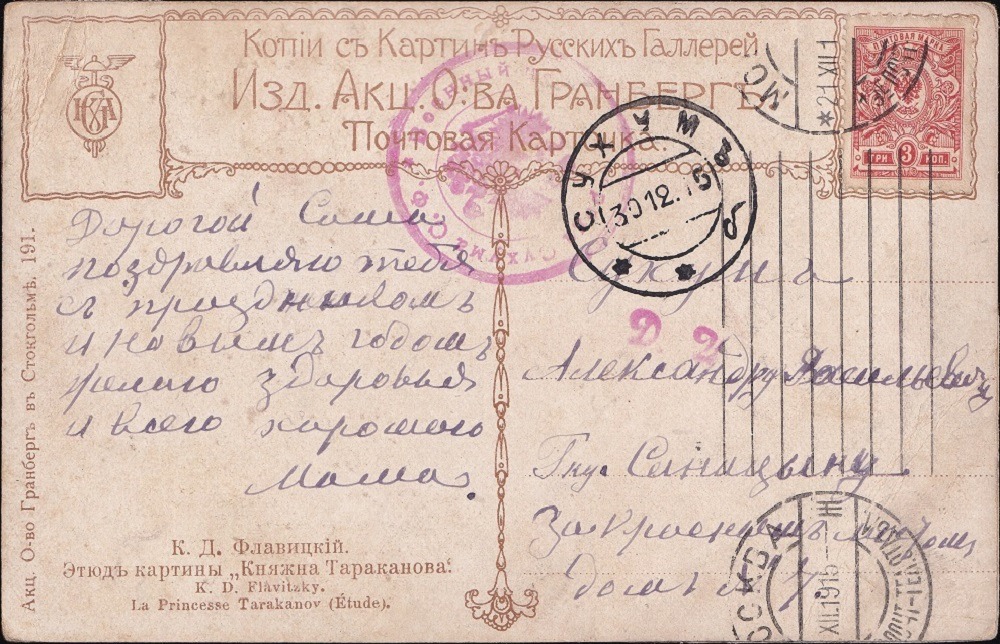 Postkarte vom --.12.1915 aus Moskau nach Suchum. Geprüft wurde auch hier bei der Ankunft. Der runde Zensurstempel ist dem Typ 1 gleich, hier jedoch mit den nicht erwähnten Initialen S.F.. Der DZ-Stempel ist gänzlich unbekannt.