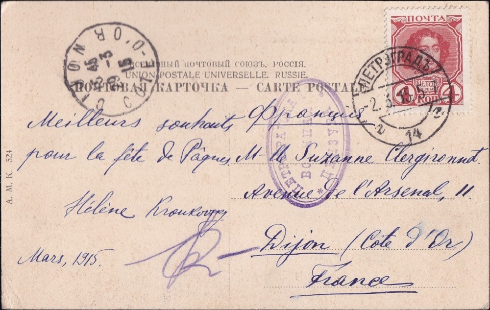 Postkarte vom 2.3.1915 aus Petrograd mit dortiger Zensur nach Frankreich. Der Zensurstempel ist der übliche Typ 3. Zudem ist eine Paraphe des Zensors zu sehen, welche keinem im Speeckaert stehenden Prüferstempel zugeordnet werden kann. Dieser Zensor ist hier möglicherweise erst nach Austeilung der Stempel tätig gewesen.