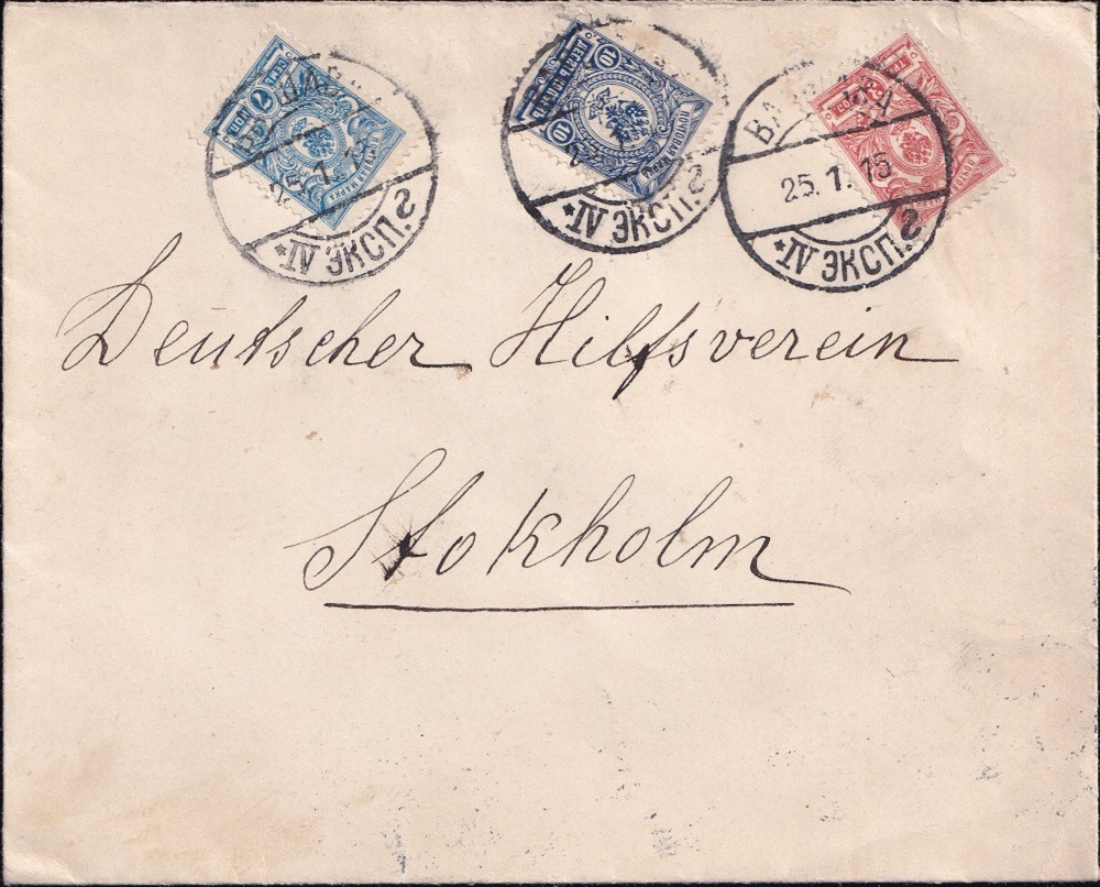 Brief vom 25.1.1915 aus Warschau, gelaufen über die Hauptzensurstelle in Minsk nach Stockholm. Eine vom Zensor N.N. Matwejew geprüfte Karte konnte ich bereits zeigen, welche nach dem Umzug nach Smolensk gelaufen war. Dieser Brief ist vor dem Umzug gelaufen.