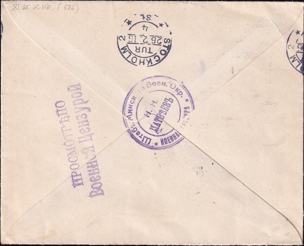 Brief vom 25.1.1915 aus Warschau, gelaufen über die Hauptzensurstelle in Minsk nach Stockholm. Eine vom Zensor N.N. Matwejew geprüfte Karte konnte ich bereits zeigen, welche nach dem Umzug nach Smolensk gelaufen war. Dieser Brief ist vor dem Umzug gelaufen.