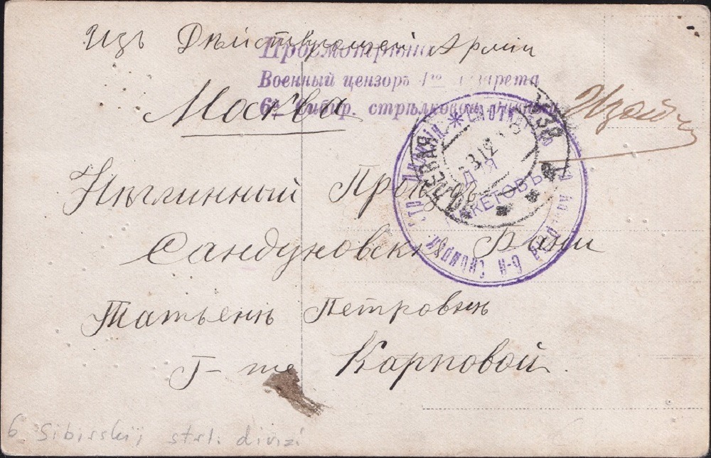 Postkarte eines verwundeten Soldaten (?) nach Moskau, aufgegeben am 13.12.1915 beim 38. Feldpostamt, geprüft vom Militärzensor des 1. Lazaretts der 6. Sibirischen Schützendivision. Diesen Zensurstempel hat Speeckaert nicht aufgeführt.