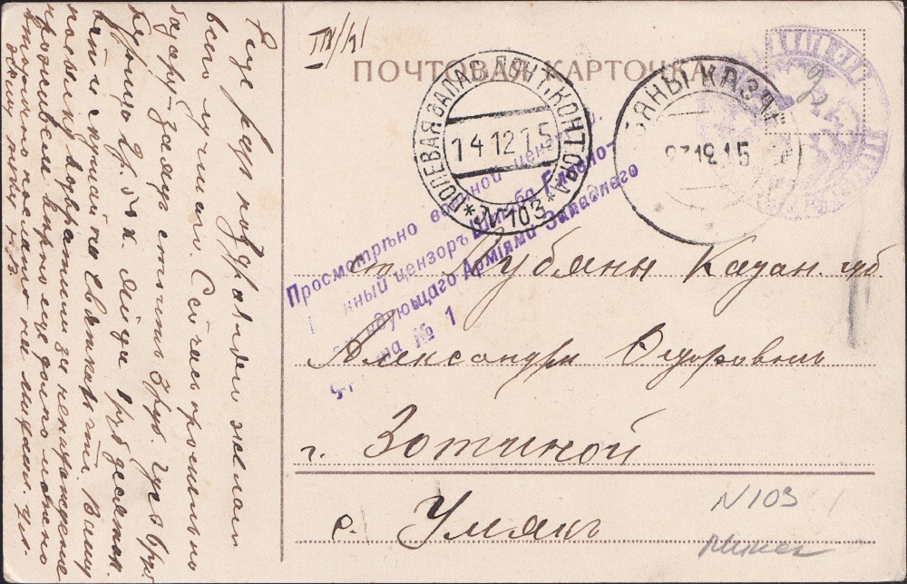 Postkarte vom 14.12.1915, aufgegeben beim 103. Feldpostamt, gesendet nach ?. Der Zensurstempel "Geprüft Militärzensur - Militärzensor des Hauptquartiers des Ober- - befehlshabers der Armeen der West- - front Nr. 1" (ich hoffe mal: richtig übersetzt) ist bei Speeckaert unbekannt. Für einen solch großen Stempel ist er sehr gut abgeschlagen.