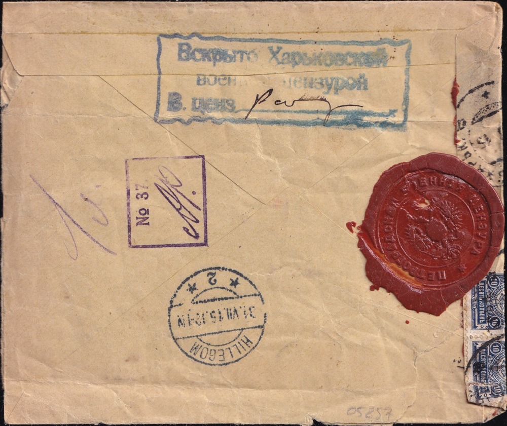 Einschreiben vom 12.7.1915 aus Woltschansk, gelaufen zunächst über die Zensurstelle Charkow und dann ein zweites Mal über die von Petrograd. Anschließend wurde der Brief nach Hillegom (Holland) gesendet.