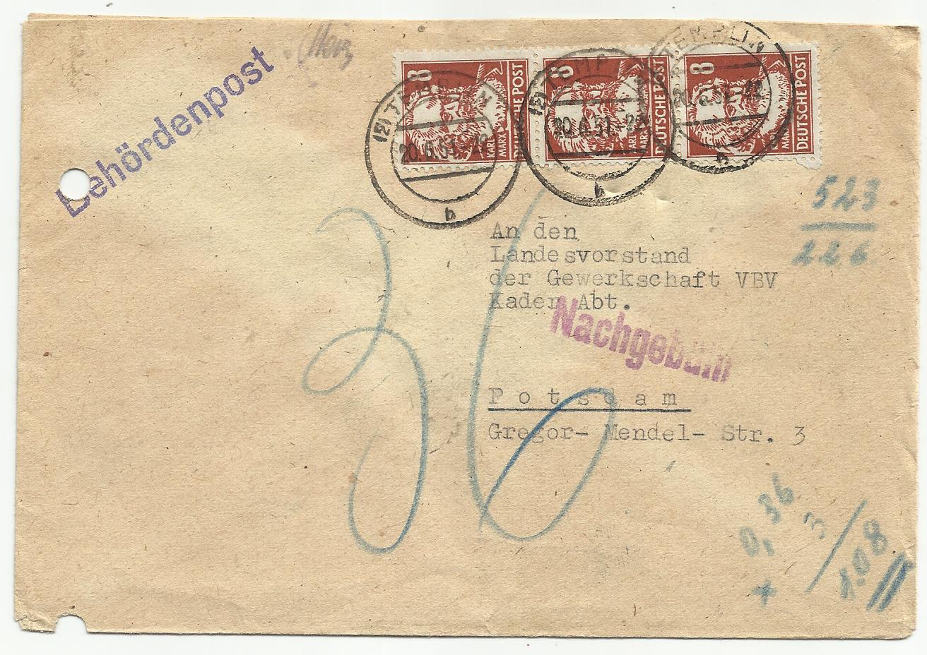 Dieser Brief wurde von von dem Kreisvorstand Potsdam Land der FDGB Gewerkschaft Veraltungen/Banken/Versicherungen mit einer Mi: 436 I frankiert an die Betriebsgewerkschaftsleitung des Rates der Stadt Teltow adressiert und als Drucksache verschickt. Die Sendung der "Sparfüchse" wurde wurde von der Deutschen Post nicht als Drucksache anerkannt und mit 23 Pf. Nachporto belegt (schöner alter Nachgebühr-Stempel). Der Empfänger scheint die Annahme deshalb verweigert zu haben.