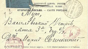 Ich beginne heute mit einer unfrankierten Ortspostkarte aus dem Jahr 1904. Sie trägt einem dunkelblauen Aufkleber (Type 05-00.01 nach Dobin/Ratner 2004) des St. Petersburger Postamts mit folgendem Text in schwarzer Schrift: