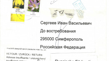 Es verging kein halbes Jahr … sagt man im Russischen, wenn etwas für die Erwartungen zu lange gedauert hat. Der gezeigte Brief war auf der Strecke Frankfurt/Main – Simferopol – Briefzentrum 05 (Niederaula) – St. Petersburg etwa fünf Monate unterwegs.