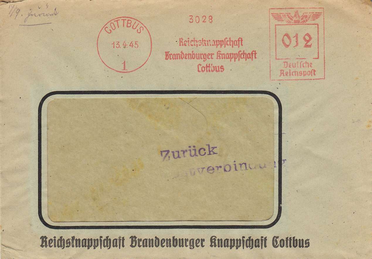 Fensterbriefumschlag der Brandenburger Knappschaft aus den letzten Kriegtagen. Leider ist der Zurück-Stempel nicht vollständig lesbar, vermutlich soll es heißen "Zurück keine Postverbindung". Schade, dass der Bestimmungsort nicht mehr zu ermitteln ist. Vielleicht kann mir jemand etwas zu diesem Stempel sagen?