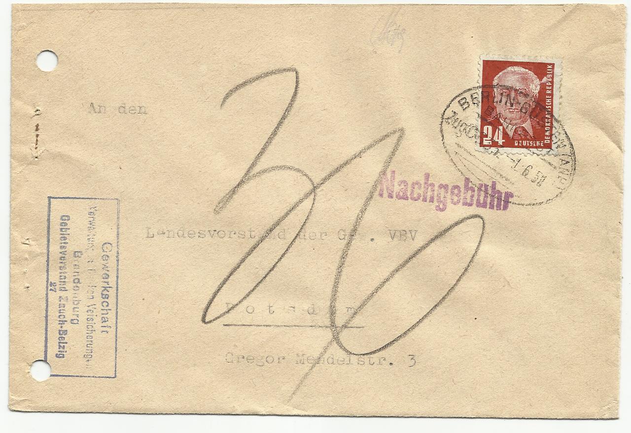 Dieser Brief wurde von von dem Kreisvorstand Potsdam Land der FDGB Gewerkschaft Veraltungen/Banken/Versicherungen mit einer Mi: 436 I frankiert an die Betriebsgewerkschaftsleitung des Rates der Stadt Teltow adressiert und als Drucksache verschickt. Die Sendung der "Sparfüchse" wurde wurde von der Deutschen Post nicht als Drucksache anerkannt und mit 23 Pf. Nachporto belegt (schöner alter Nachgebühr-Stempel). Der Empfänger scheint die Annahme deshalb verweigert zu haben.