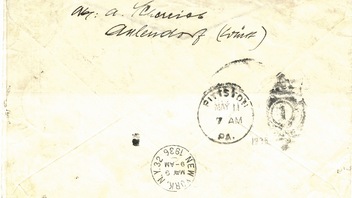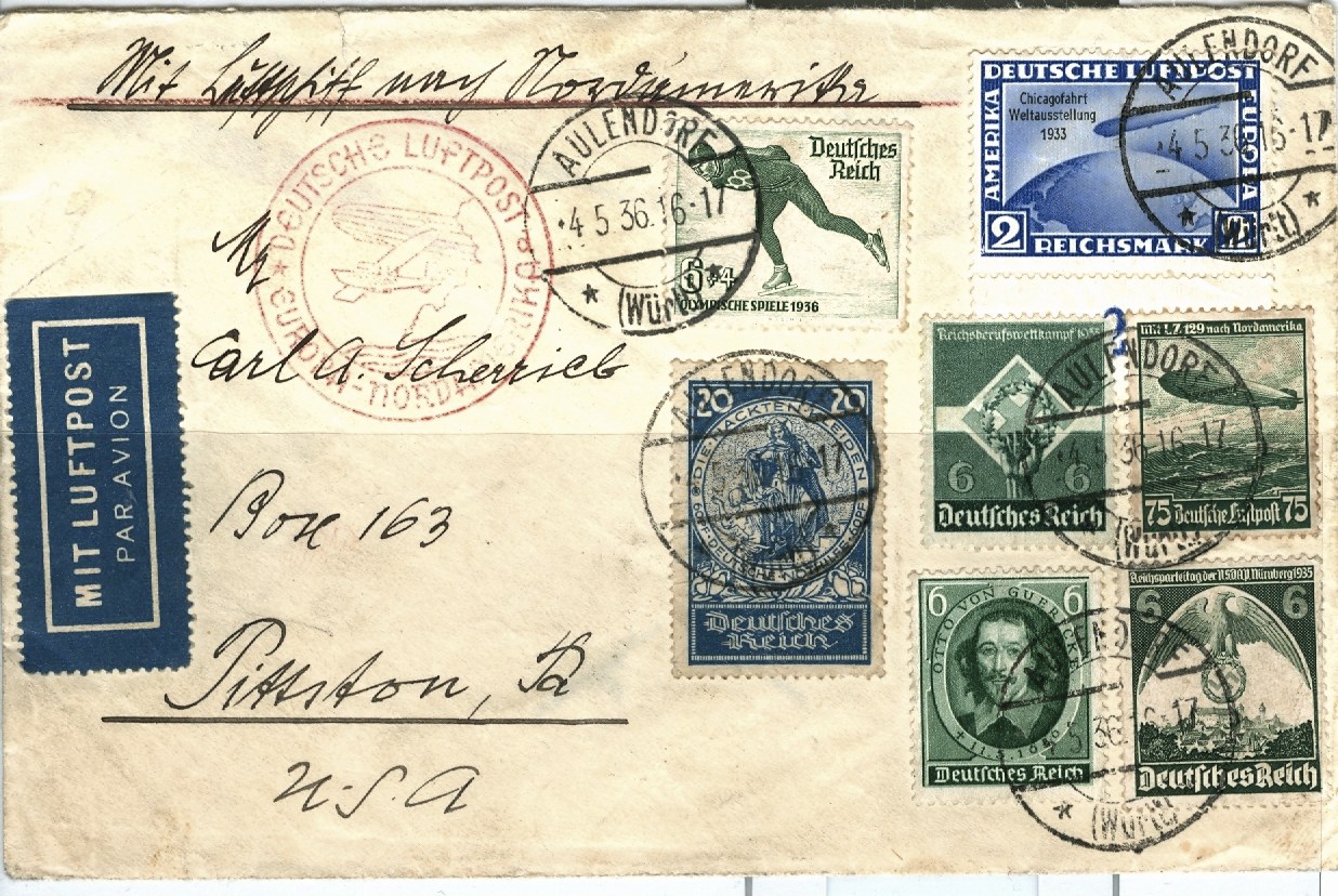 Dein Brief wurde am 4. Mai 1936 im schwäbischen Aulendorf aufgeliefert, erhielt in Frankfurt/Main den Flugpostbestätigungsstempel (mit Kennzeichen „d“) und wurde der „Hindenburg“ auf ihrer ersten Nordamerikafahrt mitgegeben.