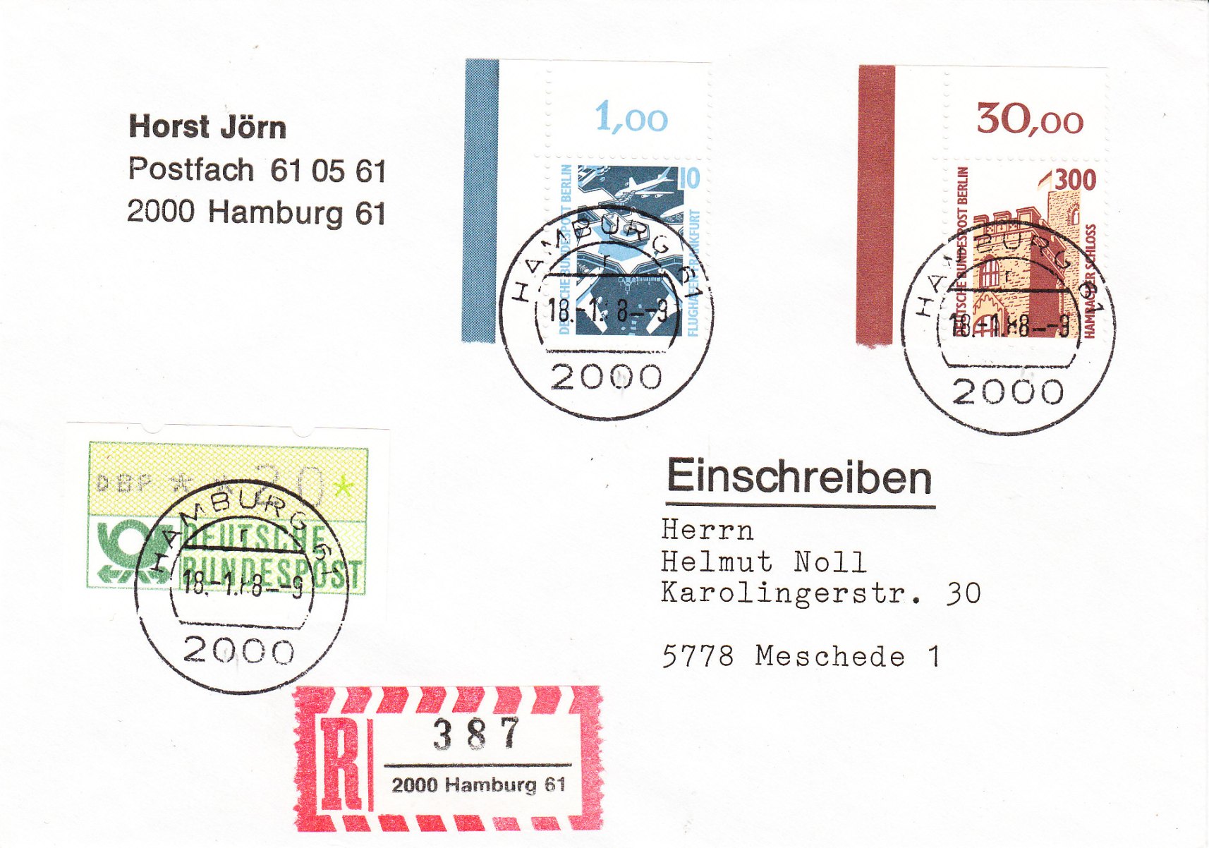 Verklebt wurden auf diesem philatelistisch beeinflussten E-Brief gleich 3 von den damals 4 in Deutschland umlaufenden „Sorten“ an Wertzeichen:
