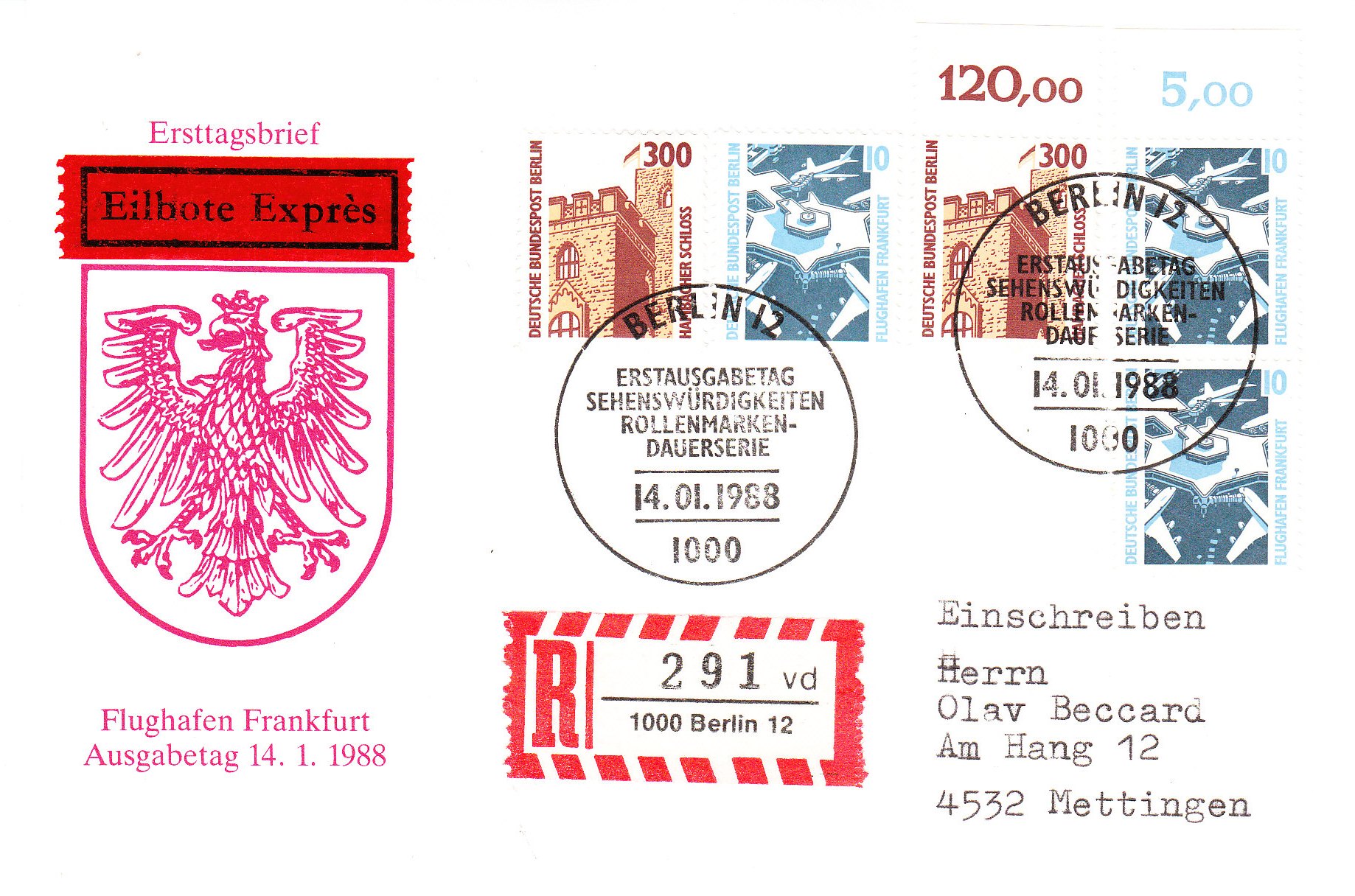 FDC der Werte zu 10 Pf und 300 Pf, Ausgabe Berlin, als Kombination von zwei Rollenmarken mit waagerechter rückseitiger Nummer sowie von Bogenmarken mit anhängendem Oberrand portogerecht auf mit 630 Pf frankiertem Brief, Porto 80 Pf, per Einschreiben, Porto 200 Pf, sowie Eilzustellung, Porto 350 Pf.