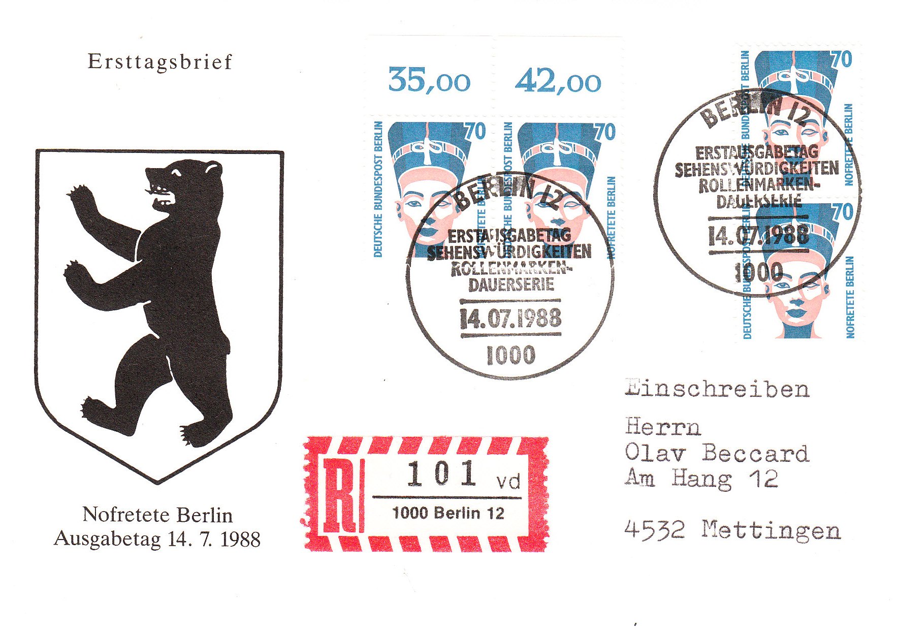 Auch dieser Brief wurde erst Tage nach dem offiziellen Ersttag zur Stempelung eingeliefert und kam am 23.07.1988 in Mettingen an, was ein Handwerbestempel auf der Rückseite dokumentiert.
