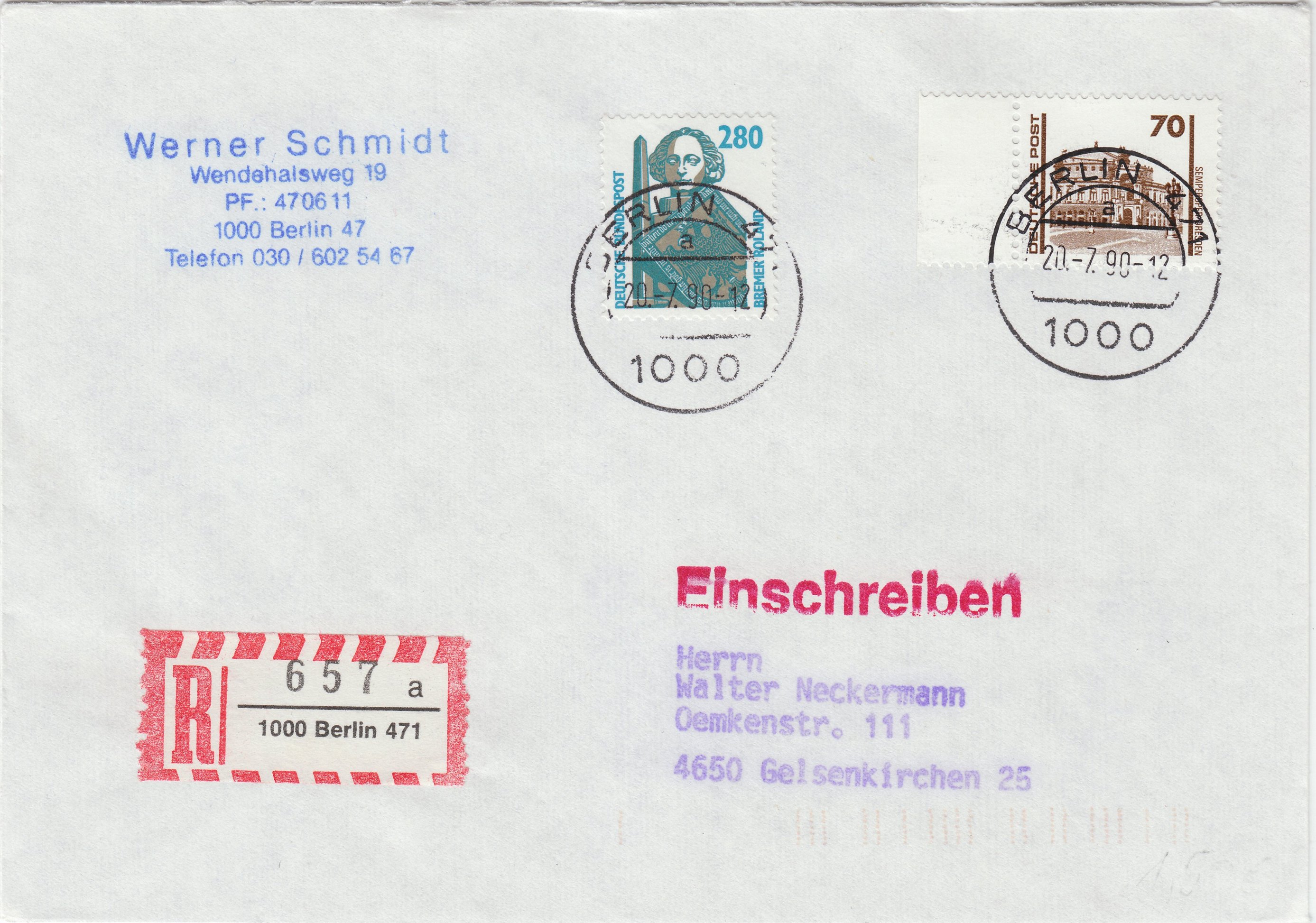 Dieser Brief der zweiten Gewichtsstufe von 21 bis 50 g dokumentiert die am 19.07.1990 mögliche MiF von Ausgaben der DS SWK, Ausgabe Bund und Ausgabe Berlin mit DDR Freimarken Bauwerke und Denkmäler.