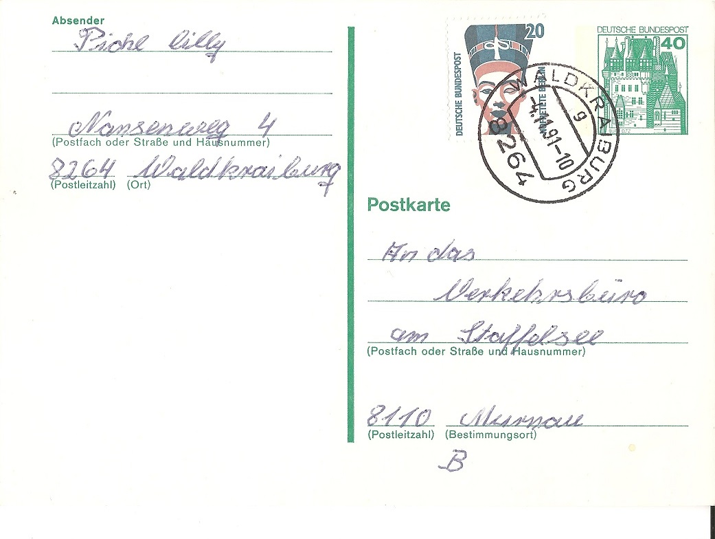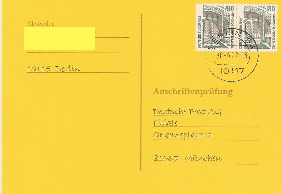 Die verklebten 1,60 DM sind umgerechnet 0,82 €. Dieses Porto galt für die Anschriftenprüfkarte allerdings erst ab dem 1.1.2003. Etwas erstaunlich diese Hellseherische Fähigkeit.