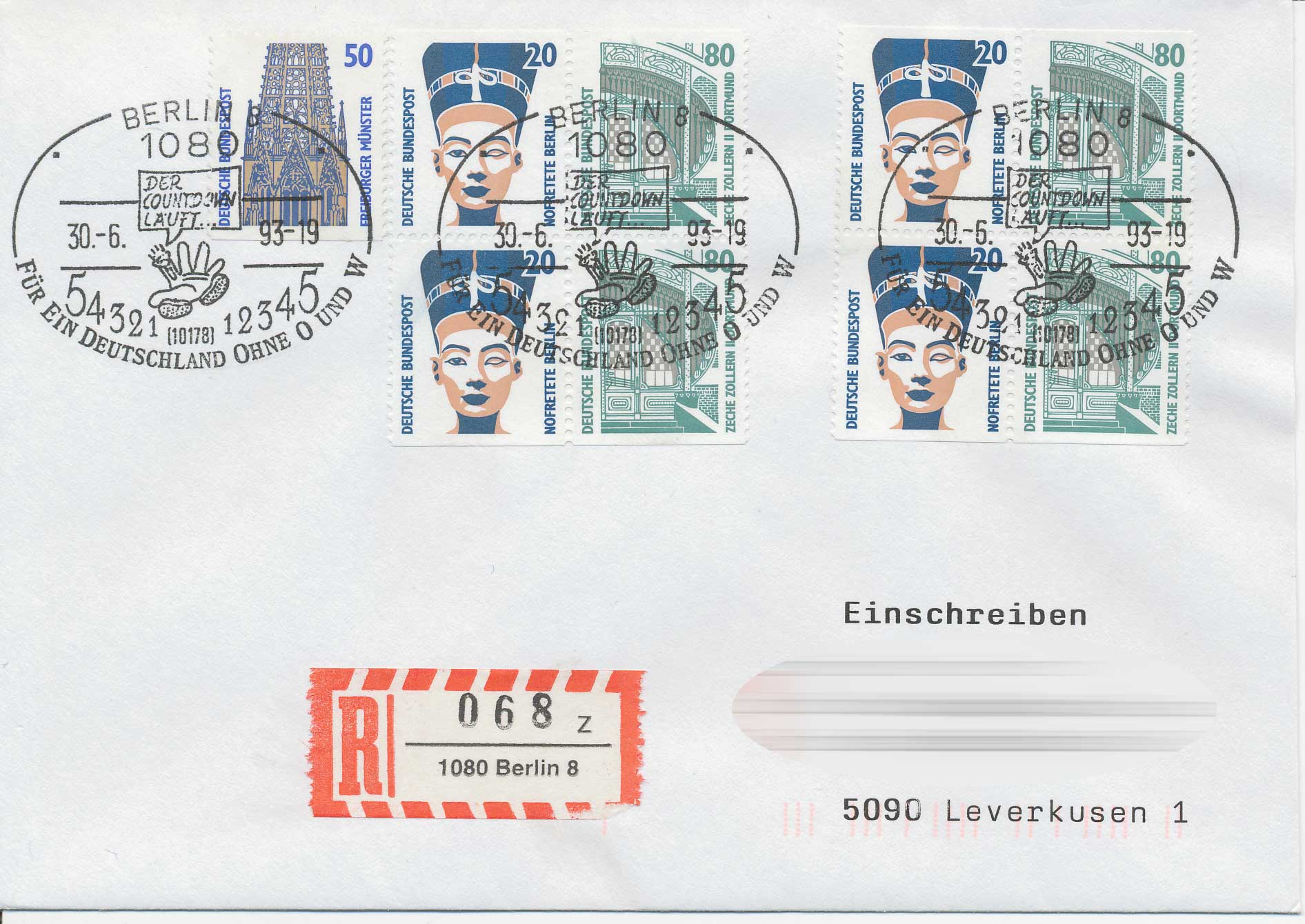 damit meine Anfrage nicht ganz so trocken daher kommt, zeige ich hier das HBl 32 aus MH 28a auf Beleg portogerecht freigemacht mit 4,50 Mark (Brief bis 20g + Einschreiben). Abgeschlagen mit Sonderstempel am 30.6.93, also einen Tag vor der offiziellen Ausgabe der MH 28a. (In meinen Michel steht sogar Ausgabedatum MH 28a: Aug. 1993 - das ist wohl ein Fehler?)