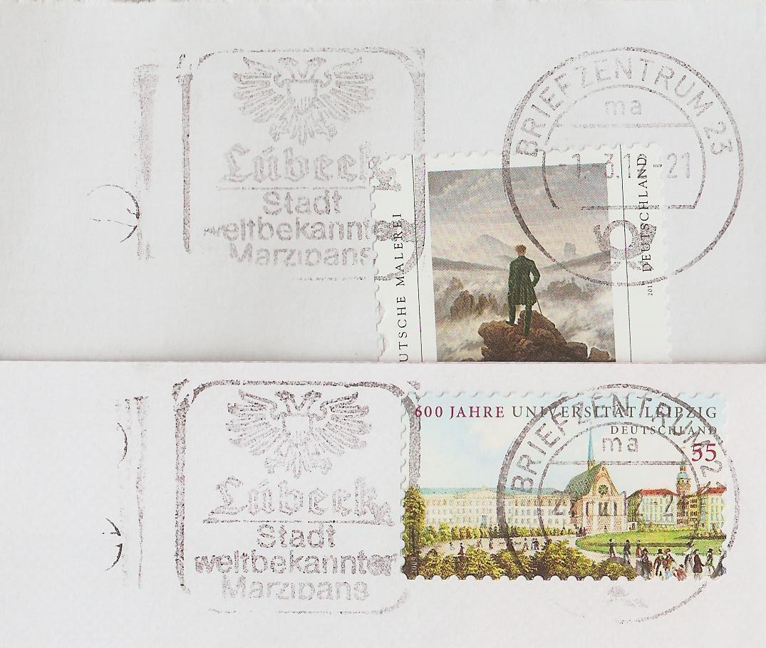Die Antwort: In Frankfurt werden zwei unterschiedliche Stempelklischees eingesetzt. In beiden Fällen handelt es sich um den Klassiker "Schreib mal wieder". Die Besonderheit: die Größe des Werbeklischees ist deutlich unterschiedlich! Die Normalvariante findet sich mit dem UB "g" wieder. Die größere hat den UB "f" .