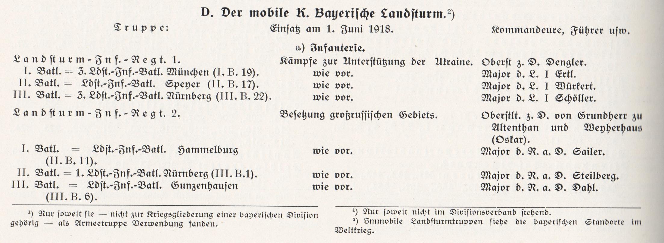 Für den ersten Weltkrieg ist es unmöglich, viele Informationen über einer Einheit mit ihrem Feldpostnummer zu finden, weil diese Nummer die Feldpostanstaltnummer ist.Ich habe gesehen, daß du auch Informationen über die Landsturmbataillone Günnzenhausen, Hammelburg und Nürnberg suchtest.
