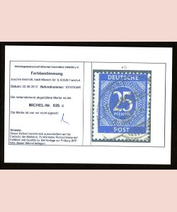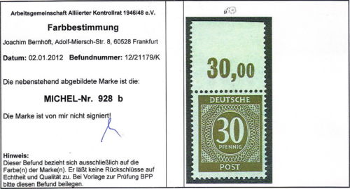Sicherlich ist es nicht die Aufgabe eines Farbprüfers, Oberrandzähnungen zu sichten. Wer aber solch einen Mist (indirekt) durch einen Farbbefund vergoldet, schädigt dem Sammelgebiet Kontrollrat und dem Geldbeutel der Sammler. Herr Bernhöft, hier ist alles FALSCH !!!