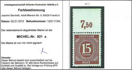 Sicherlich ist es nicht die Aufgabe eines Farbprüfers, Oberrandzähnungen zu sichten. Wer aber solch einen Mist (indirekt) durch einen Farbbefund vergoldet, schädigt dem Sammelgebiet Kontrollrat und dem Geldbeutel der Sammler. Herr Bernhöft, hier ist alles FALSCH !!!