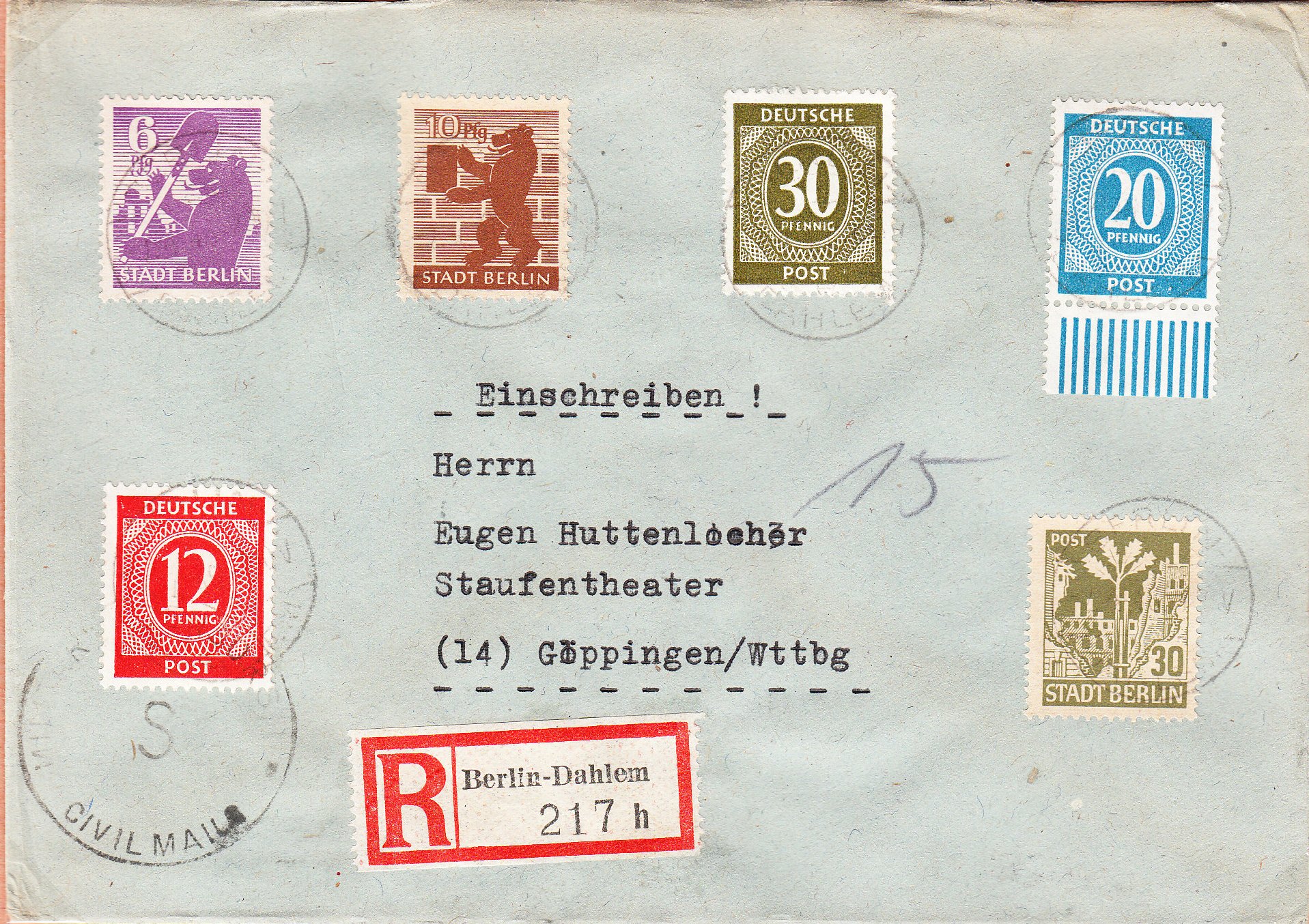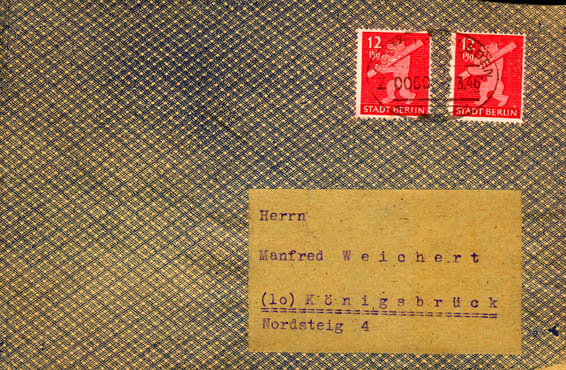 Fangen wir heute an mit einem R-Fern-Doppelbrief der Portostufe 108 Pf vom 03.04.1946 aus Berlin-Charlottenburg 9, portogerecht frankiert als MiF mit gleich vier Werten unseres Objektes der Begierde, den Berliner Bären, sowie fünf Werten der Kontrollrat Ziffernserie der Gemeinschaftsausgaben.