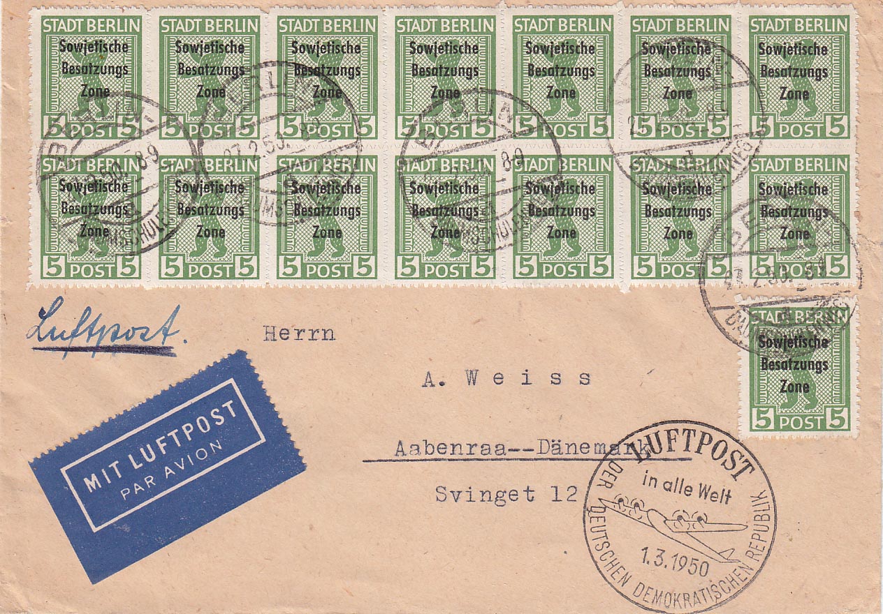 Briefe mit Marken mit SBZ-Aufdruck durften aber vorher aufgeliefert werden (hier in Berlin am 27.2.1948) um mit der DDR Luftpost in alle Welt zu fliegen.