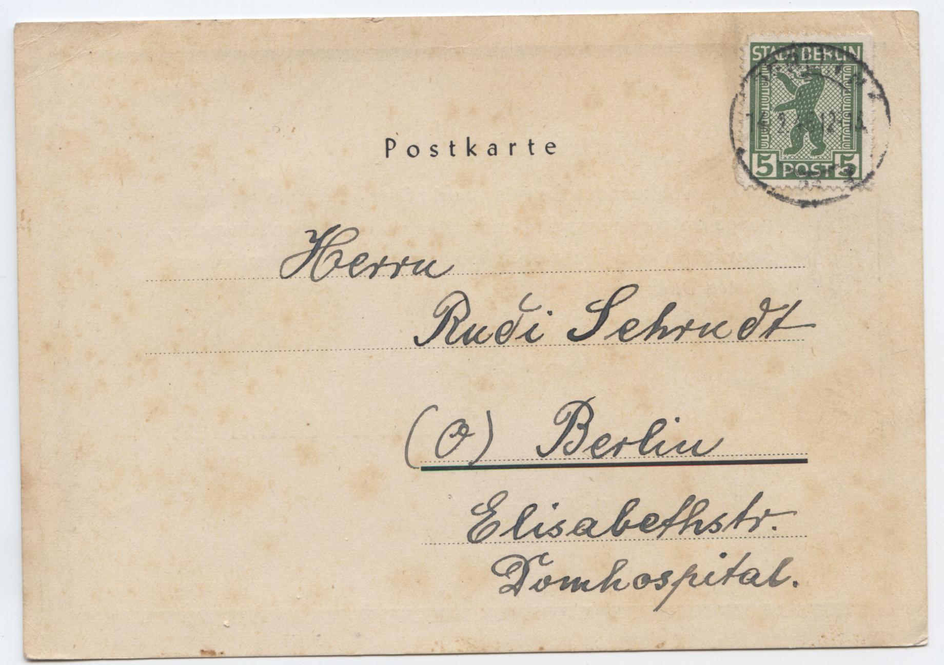 Postkarte mit Stempel Berlin W 9 l vom 25.8.45 (Absender Schauspielschule des Deutschen Theaters)