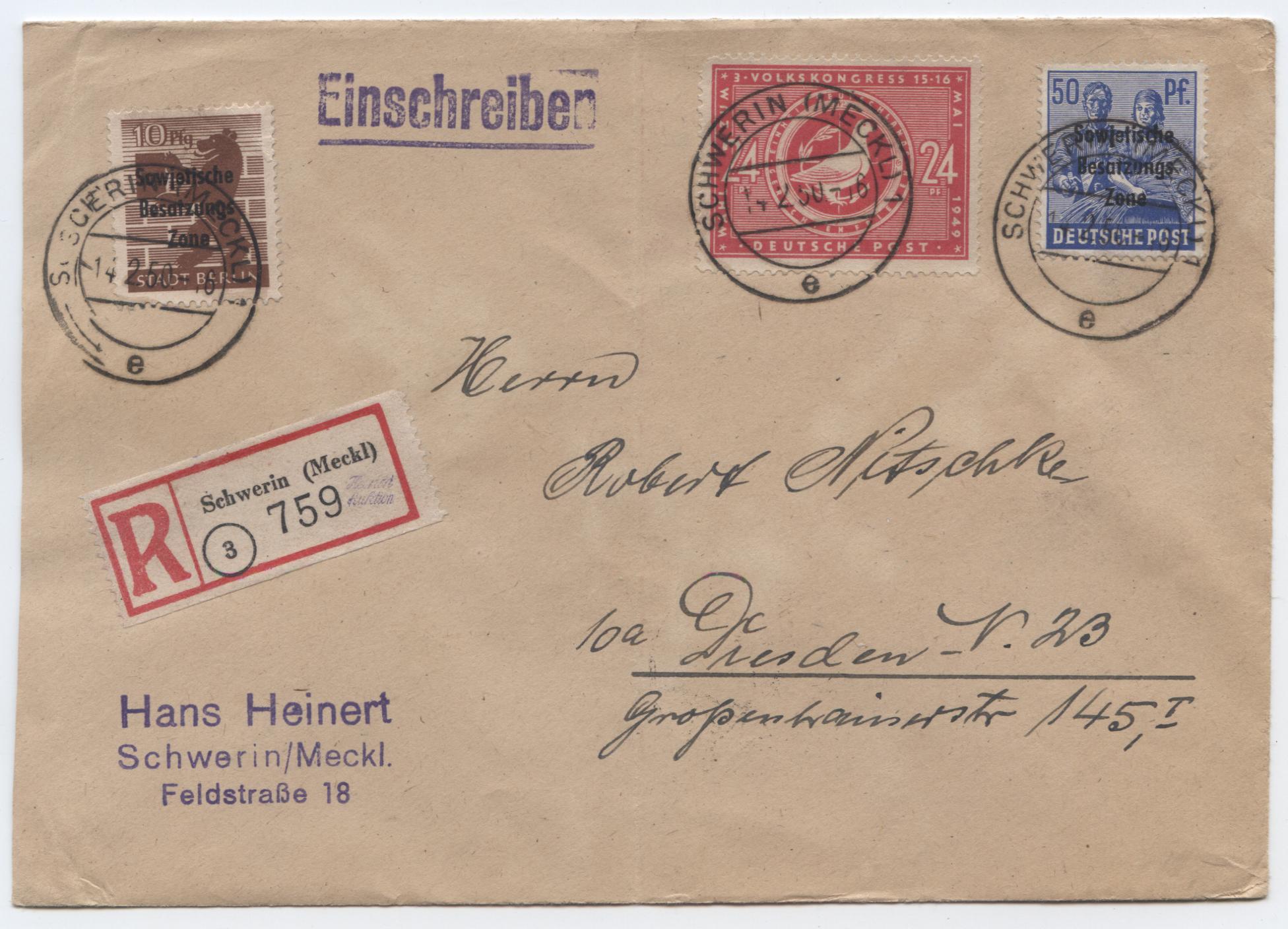 vor kurzem bekommen, Einschreiben von Schwerin nach Dresden mit einer tollen MiF von Mi.Nr.194, 203 A und 232.