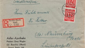 Fernbrief (24 Pf) per Einschreiben (60 Pf) ab (2) Beelitz (Mark) am 01.06.1946, dargestellt als MiF eines Zweierstreifens der Mi.Nr. 919 Kontrollrat Ziffernserie vorderseitig sowie eines Dreierstreifens der Mi.Nr. 6 A der Bärenausgabe für Berlin und Brandenburg, die bis zum 31.10.1946 gültig war.