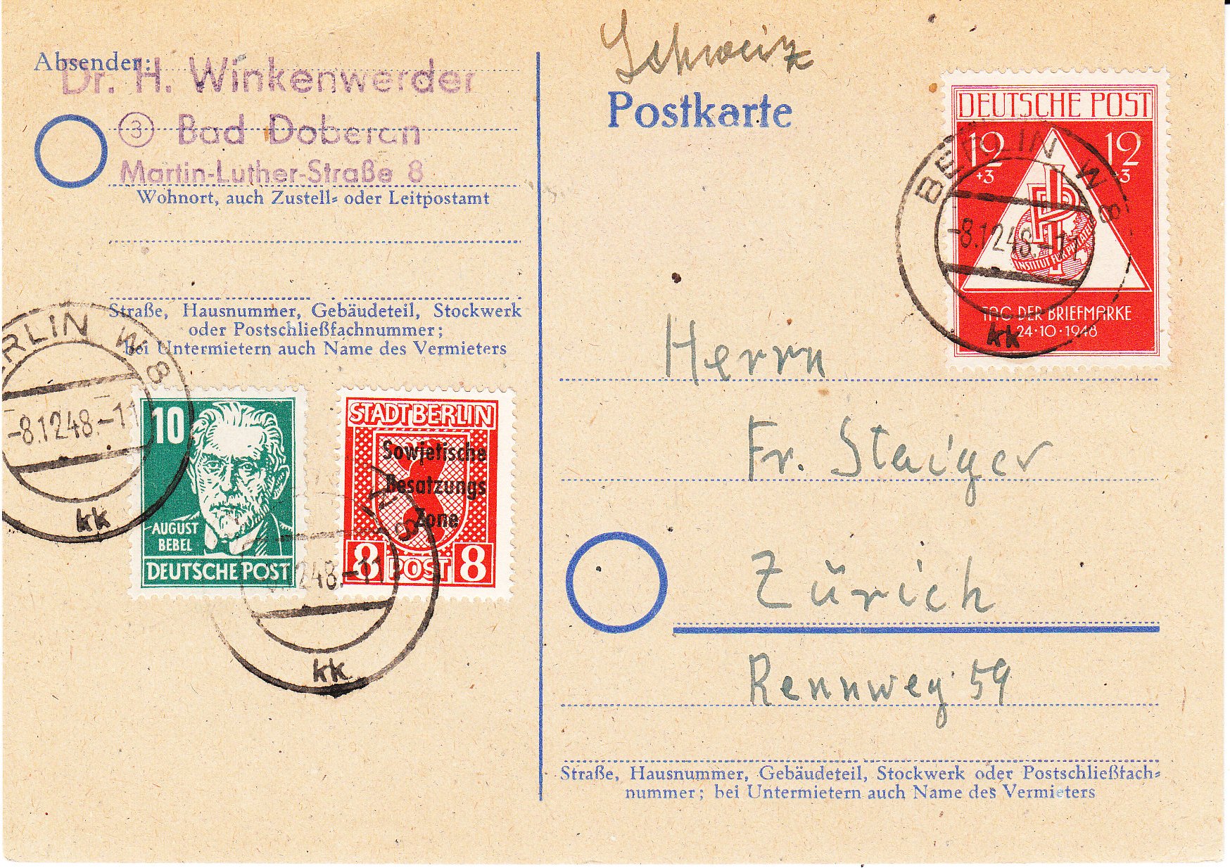 Heute bekam ich von einem lieben Sammlerfreund beim Tauschtag in Köln diese Postkarte in die Schweiz vom 8.12.1948, Portostufe 30 Pf, freigemacht als MiF unter Verwendung einer SBZ Michel 202 A, Urmarke ist die SBZ 3 A.