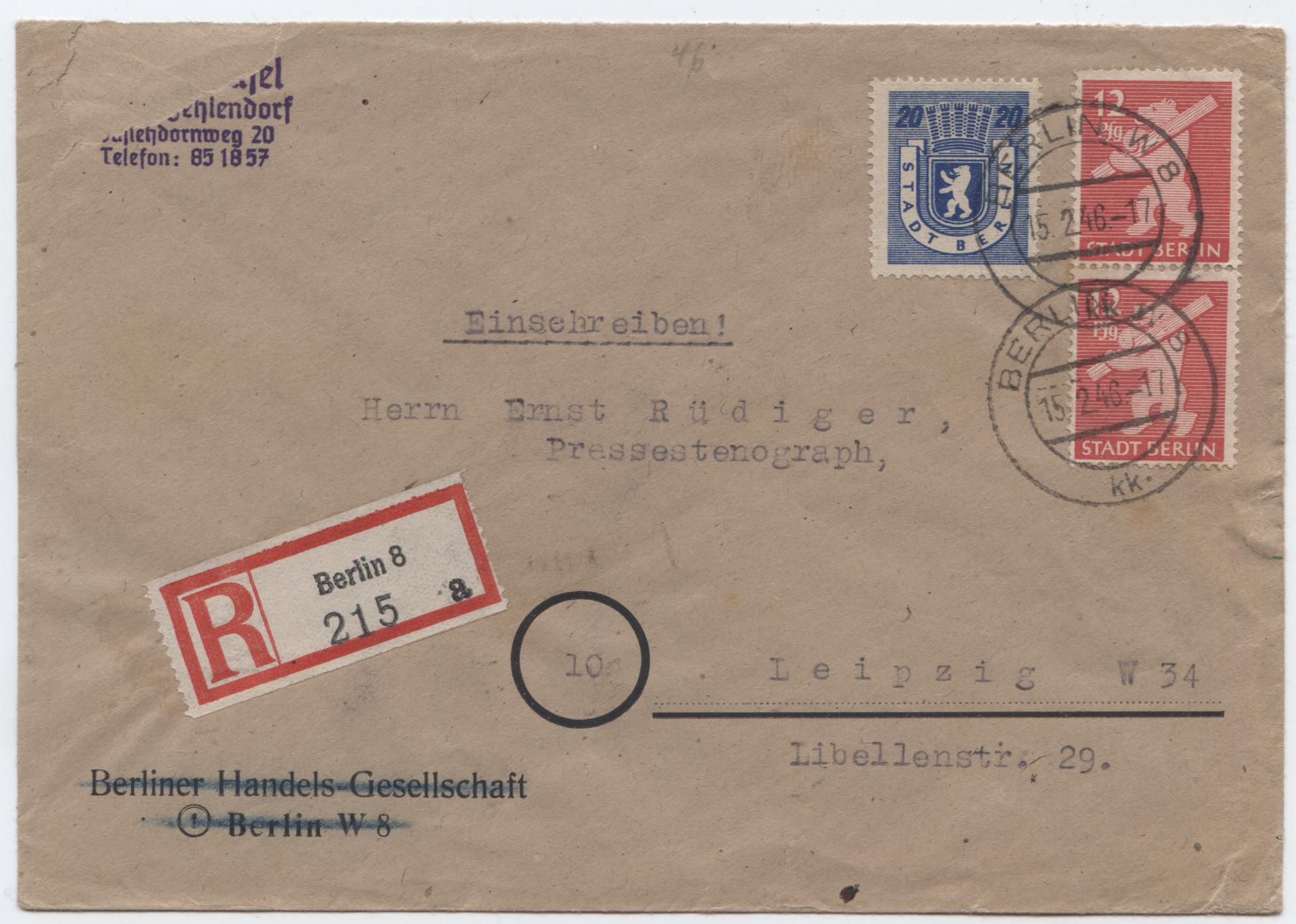 Portogerecht im Ortsverkehr mit 16 Pfennig der Überdruckmarken Mi.Nr.3 A SBZ Mi.Nr.202 A.