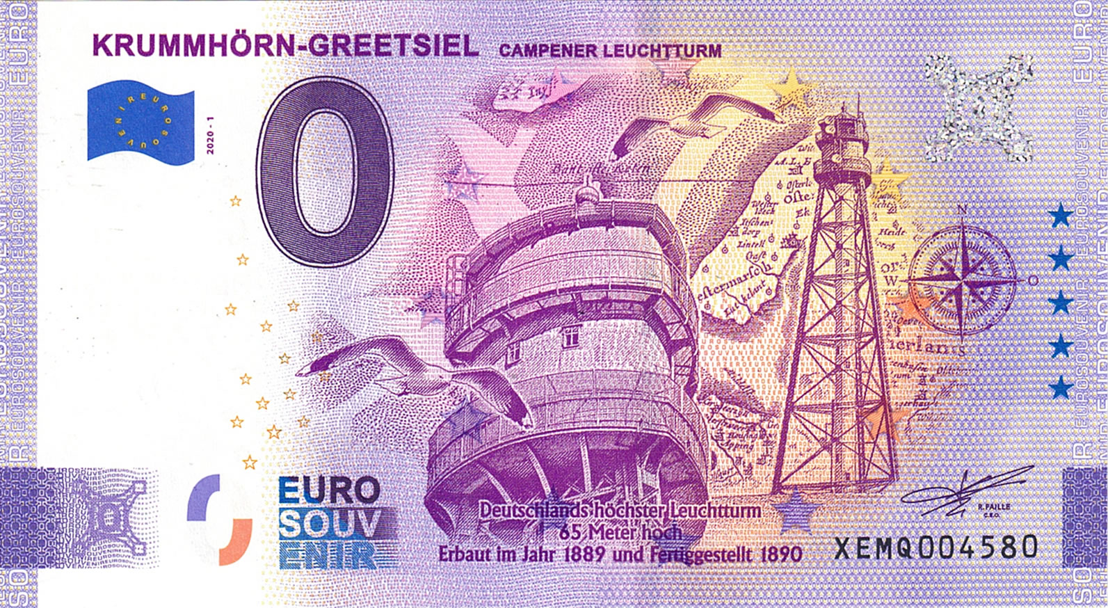 2020 kam auch bei den Null-Euro-Scheinen, die eigentlich schon so gut wie totgesagt waren, überraschend ein Leuchtturm-Motiv mit dem Campener Leuchtturm heraus, als Ortsangabe steht Krummhörn-Greetsiel dabei. Dieser Leuchtturm ist der höchste in Deutschland und gehört auch zu den höchsten Leuchttürmen der Welt.