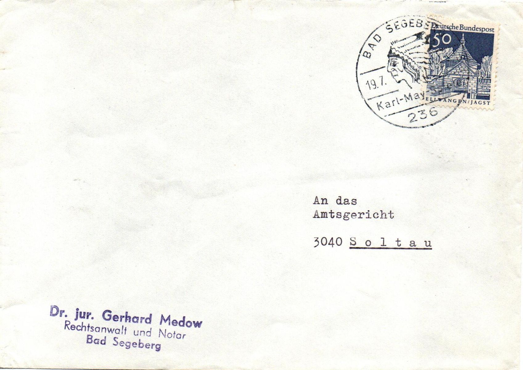 Hier als Einzelfrankatur mit einer 50 Pf. Bauten II dargestellt. Die Marke ist dem Werbestempel "Bad Segeberg Karl.May-Spiele 19.7.68 -20" entwertet