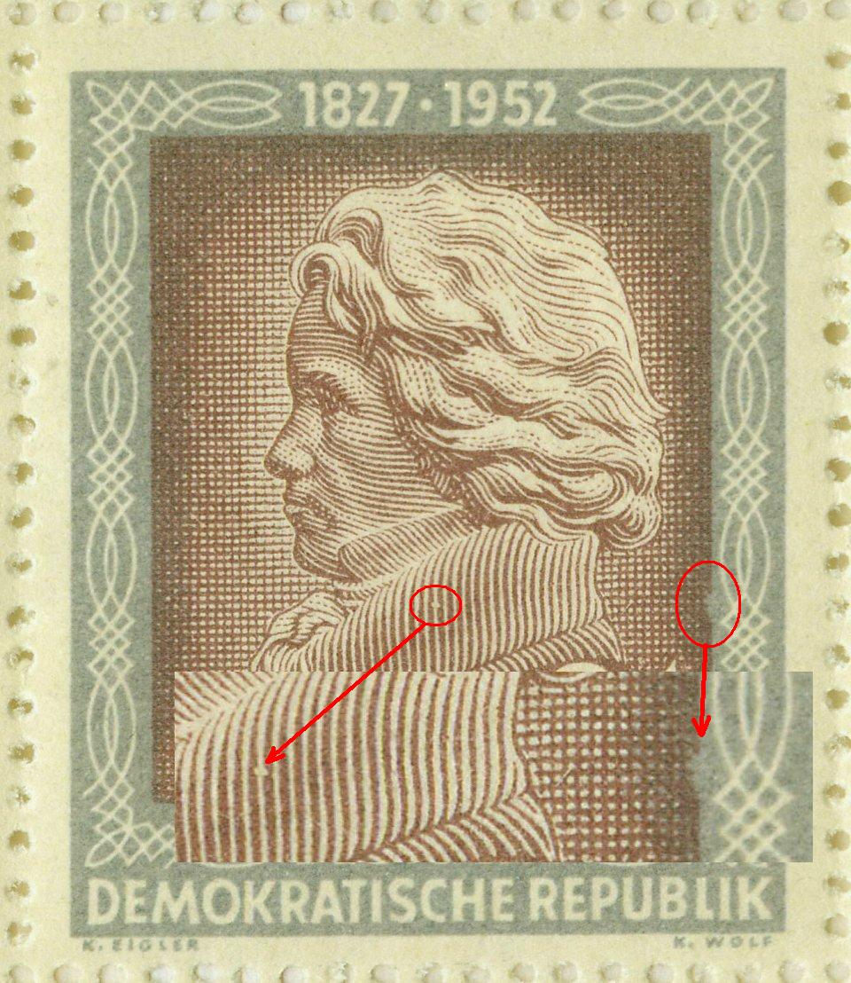 Bildrahmenschaden rechts unten und Einkerbung in Kragenlinien