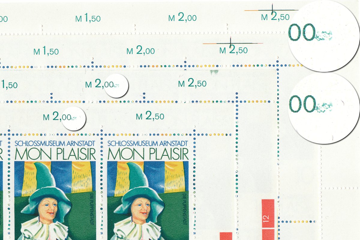 - Oberrandfehler auf nur einer Bogennummer vorkommend, zweimal vorhanden auf bogengestempelter 10er Einheit.