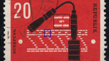 589 mit zwei sehr schön auffälligen Abweichungen: 1x Fleck im Markenbild , 1 x Rahmenbruch rechts unten
