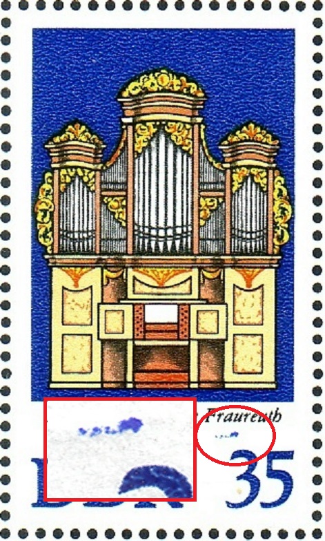 1511 Block 30 (b) - blauer Strich (Rasterfehler) im hellblau über der linken Testbildecke sowie Rasterfehler über und links neben "M" von "MARK"