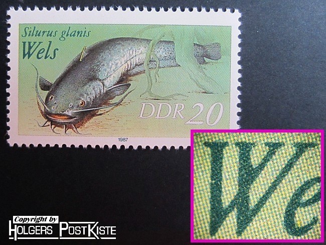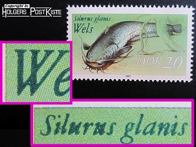 3097_b = unterer Kreuzungsbereich des "W" von "Wels" verdickt sowie beide "n" von "Silurus" und "n" von "glanis" verdickt