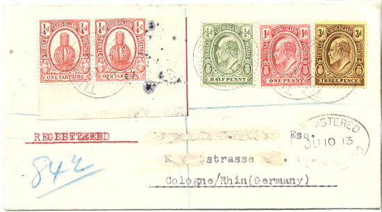 Brief vom 21.2.1936 mit einer Marke von diesem Motiv. Zu beachten ist, dass die Marken mit Kopf von König Georg V. auch je zwei Melokakteen haben.