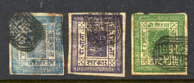 die blaue Marke in der Mitte sieht mir stark nach Mi.-Nr: 1AaI von 1881 aus Nepal aus. Es wäre hier tatsächlich ein detailierterer Scan beider Seiten notwendig, um genaueres zu sagen. Wie es aussieht, ist es ein schönes Exemplar.