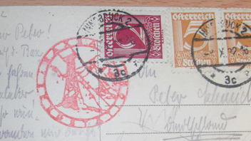 Im Kartentext kann man den Namen „Rax“ lesen. Der Rax ist ein Berg in Österreich, auf den eine Seilbahn hinaufführt. Die Inschrift auf dem roten Stempel ist sehr verschwommen, oben könnte aber Raxbahn stehen und unten Bergstation. Das ist nur ein Werbestempel der Bergbahn, der bereits mit der Karte verkauft wird, das sieht man daran, dass die linke Marke über dem Stempel geklebt wurde. Auf der Bildseite müsste der Berg oder die Bergbahn sein. Also ein privater Werbe-Stempel, der schlecht abgeschlagen wurde.