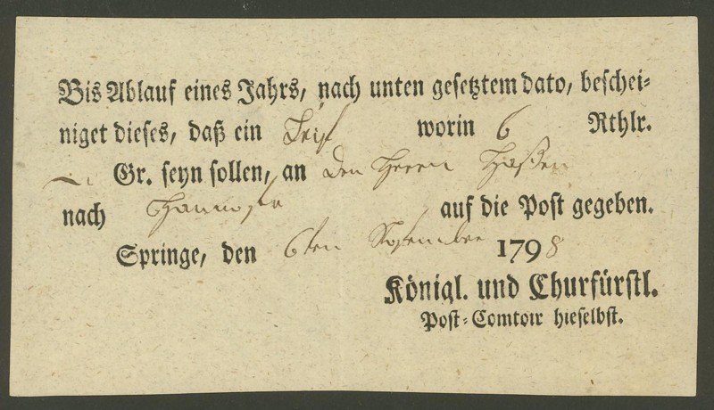 Ich beginne heute mit einem Postschein aus Springe; der Ort müsste damals zum Königreich Hannover gehört haben.