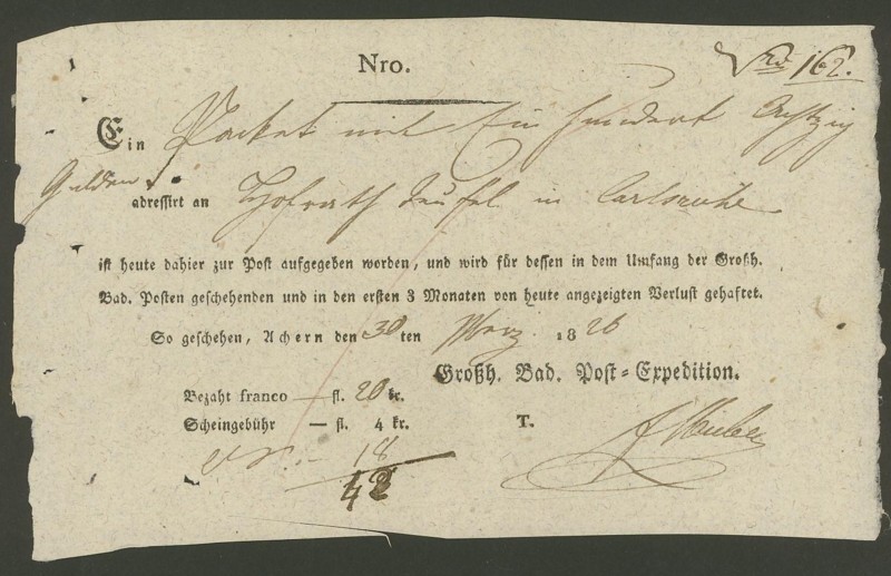 Bei Aufgabe eines Poststückes, das mit einem angeblichen Wert deklariert war, fertigte die zuständige Postdiensstelle eine Abgabebestätigung aus, mit der für einen exakt definierten Zeitraum bei Verlust des Poststückes für dessen Wert postamtlich gehaftet wurde. Die verwendeten Formulare variierten zwischen den unterschiedlichen altdeutschen Staaten zum Teil erheblich, der Inhalt der Vordrucke jedoch war stets ähnlich. Ich habe vor, aus einigen der altdeutschen Staaten solche Aufgabescheine zu zeigen (mein persönlicher Bestand ist recht überschaubar), und auch wenn ich nicht immer alles entziffern kann, so glaube ich doch, dass auch solche philatelistischen Belege, die nur wenigen geläufig sein dürften, ihren Platz in Sammlungen haben sollten, die sich mit der Zeit der frühen Briefmarkenausgaben oder auch der Zeit davor beschäftigen.